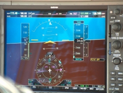 | Der Motor läuft, das Garmin 1000 ist aktiviert und das PFD (Primary Flight Display) zeigt schon die wichtigsten